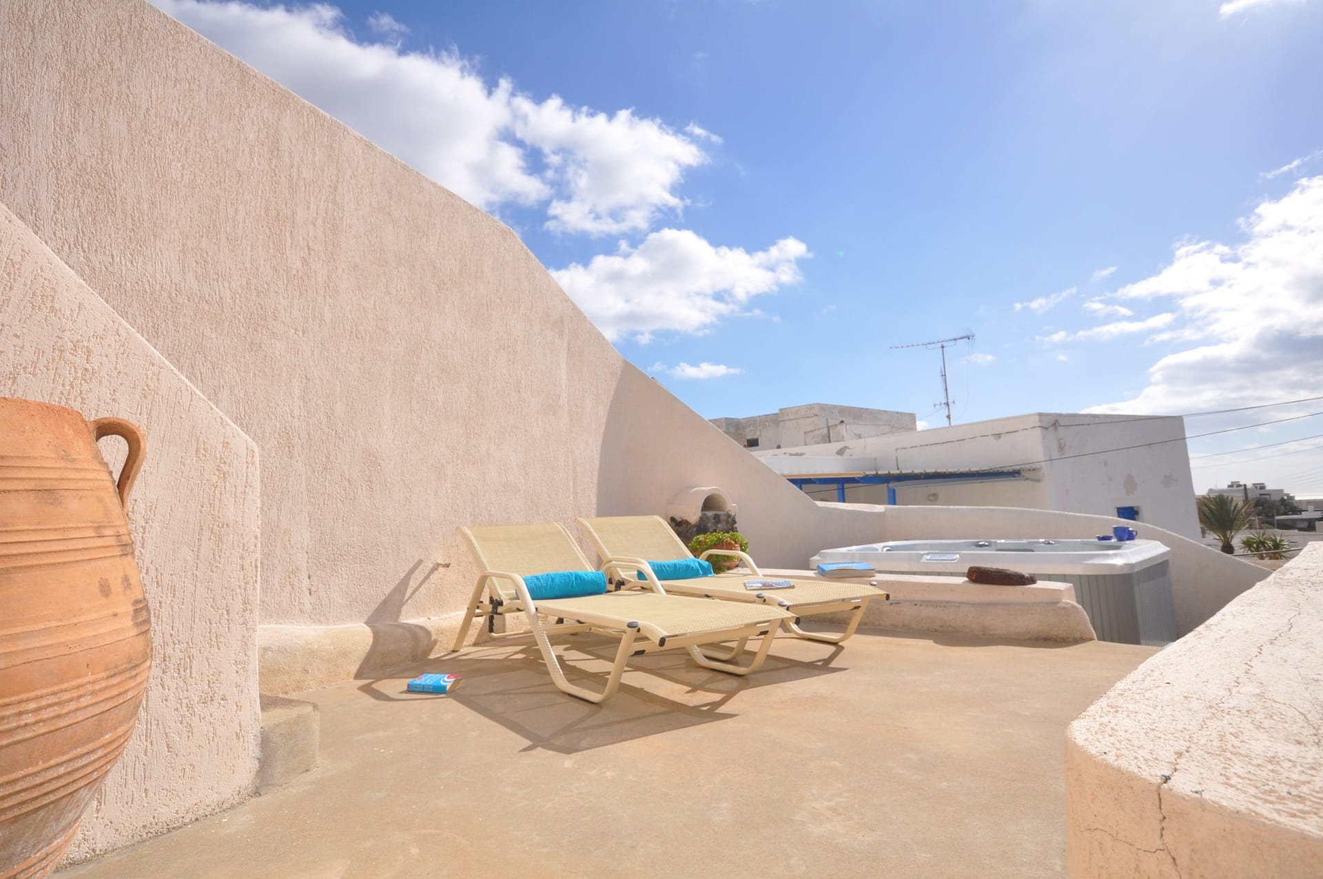 The Villa Features: Lounge and dining room ,2 double en-suite bedrooms, Fully Equipped Kitchen with modern appliances, enclosed courtyard with umbrella and Alfresco Dining .Multilevel roof top terraces with chemical free hot tub, sunbeds ,view of the village and the Aegaen Sea in distance a, laundry room with washing machine.