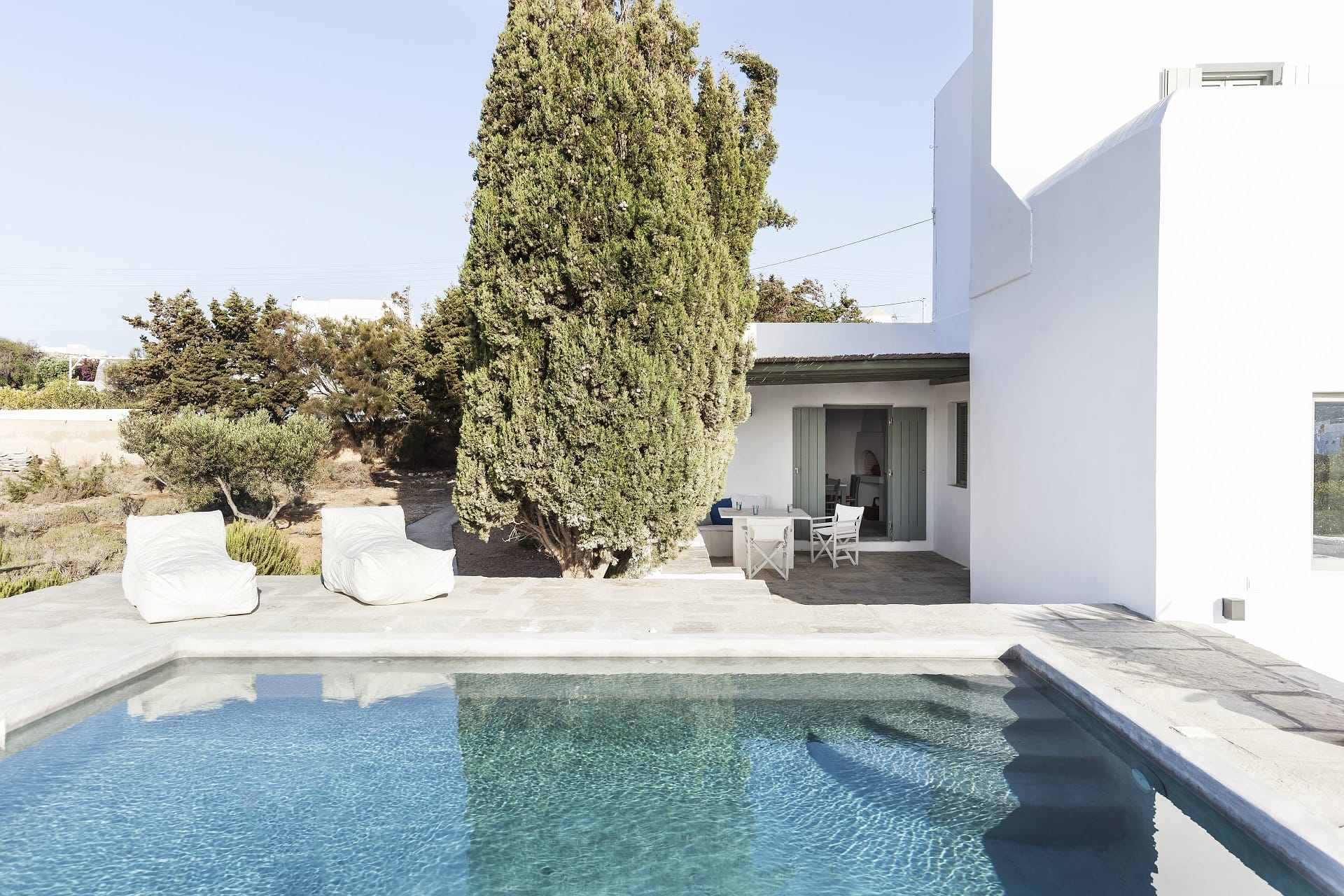 Elia Villa in Santa Maria is a white Cycladic 4 bedroom villa with large terraces, pool and direct access to a beautiful sandy beach.