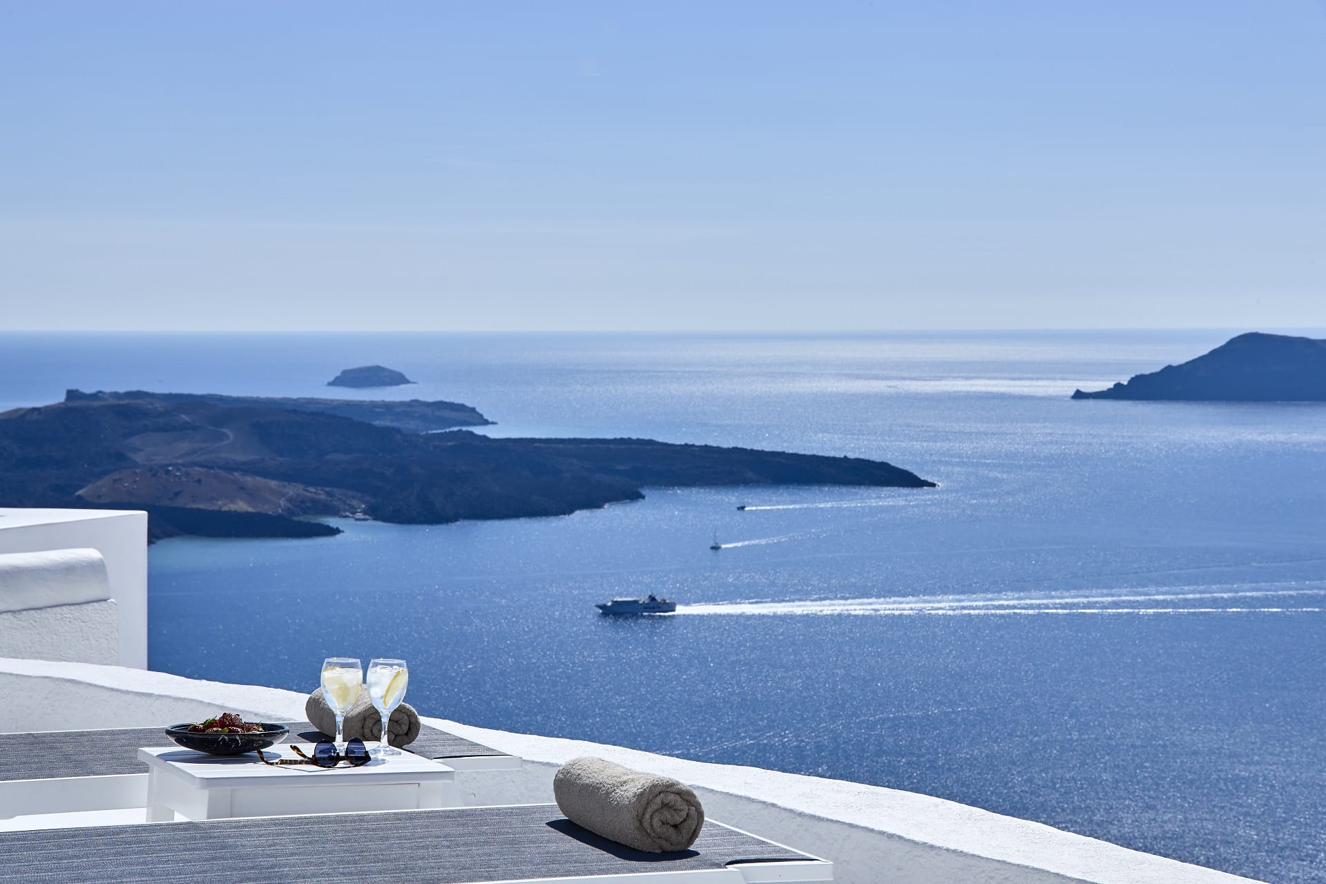Nautilus is a 3 bedroom Residence situated at Firostefani village , just a step away from fabulous restaurants, shops and just 10 minutes walk from Fira. It offers 3 bedrooms, outdoors Jacuzzi, sunbathing terraces, panoramic views of the sea and the volcano and beautiful sunsets. From the main door you enter to the main courtyard with outdoors sitting- dinning area with amazing views. Stairs lead up to the two upper floor roof top terraces with sun beds for sunbathing and outdoors Jacuzzi with beautiful sea views.